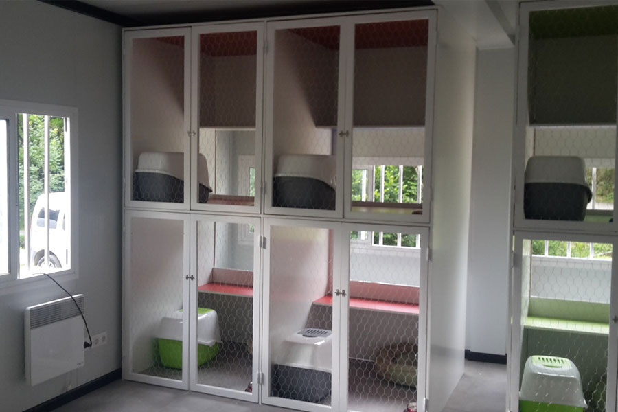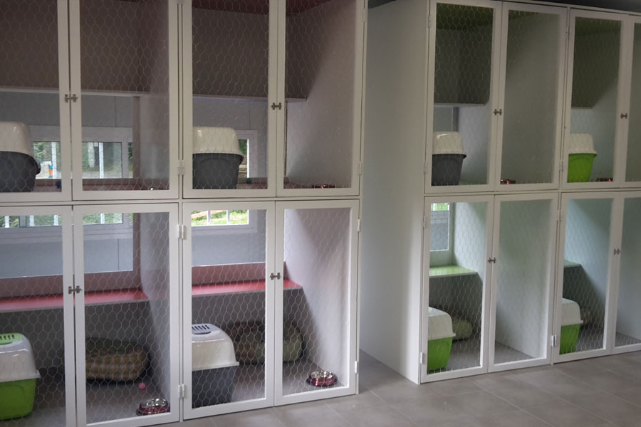 El edificio cuenta con 8 jaulas individuales diseñadas en exclusiva para ellos. Disponen de una amplia cristalera para hacer más entretenida su estancia.