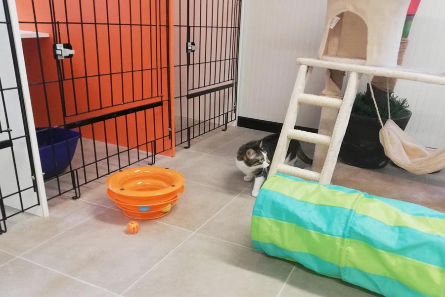 Los gatos salen a la zona de juego, siempre, de manera individual, excepto los pertenecientes a la misma familia, alojados en jaula doble.